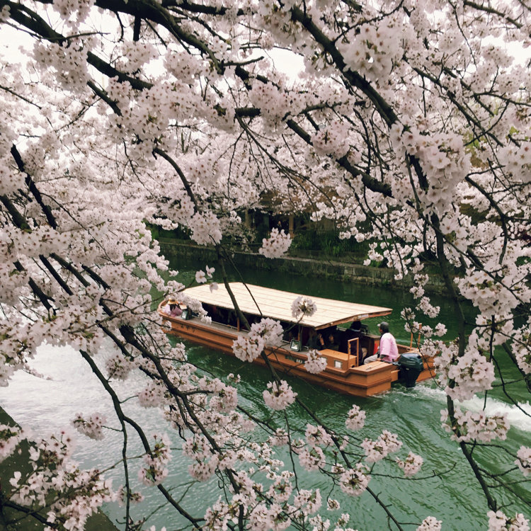 行き交う人の注目を浴びつつ、舟からの眺めは最高でした💕疏水と橋の間に舟の高さはギリギリで、高さがない所は、舟の屋根の高さが低くなったりとスリル満点です😁
