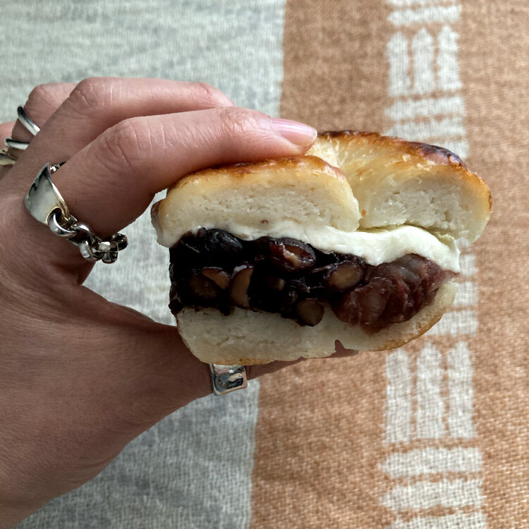 ☆ マルイチベーグル ☆ むぎゅっと。断面萌え?? 米粉のベーグル。バターと金時豆。 ついつい「美味しすぎる〜!!」と叫んじゃう。 #白金高輪 #マルイチベーグル #ベーグル #百名店