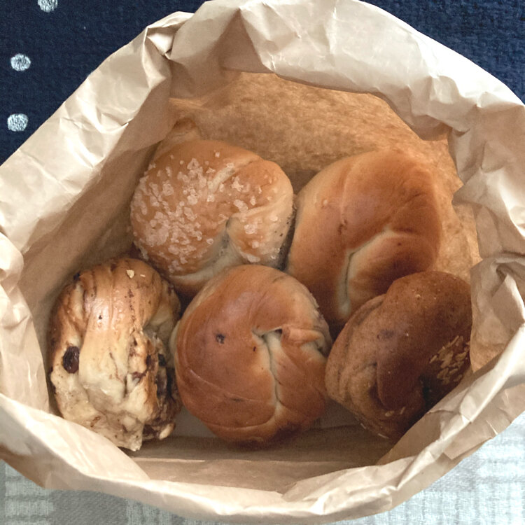 ☆ マルイチベーグル ☆ 持ち帰ったベーグル。 プレーン、ブルーベリー、セブングレインハニー など。 平日でも早めに行かないと種類が少なくなるので昼前位に行きました。 お客さんは店内5名と制限がありましたが次々と。 定期的に通いたくなるベーグル屋さんです♡ #マルイチベーグル #白金高輪 #ベーグル #百名店