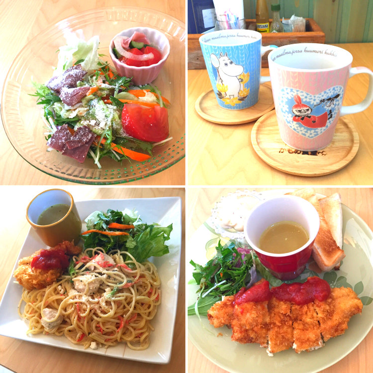 北欧風のインテリアがかわいい《かもめ食堂》でランチ☺︎ おしゃれなカフェってちょっと量が少ないな〜ってことが多いけど、ここはごはんもドリンクもたっぷりでお腹いっぱいになるのがうれしい♪ 桜えびのパスタもチキンカツプレートもボリューム満点でとっても美味しかった♡ ムーミンのカップで飲むはちみついちごティーもホッとする味でした♡