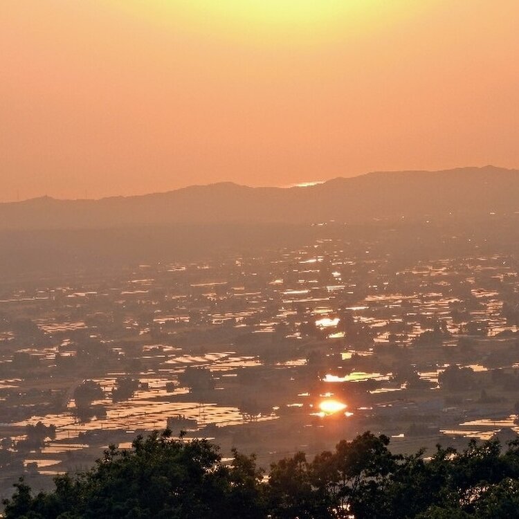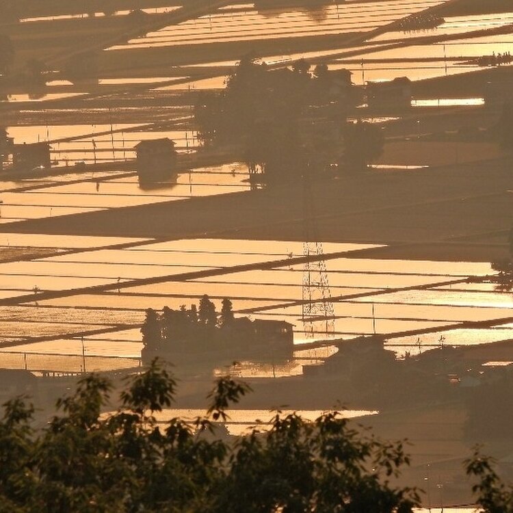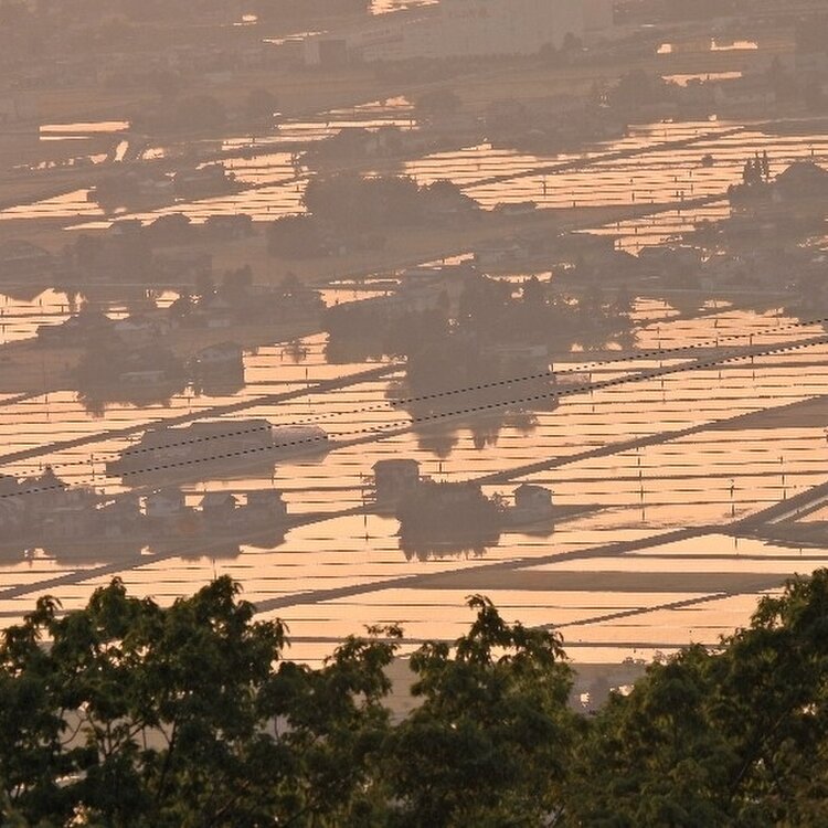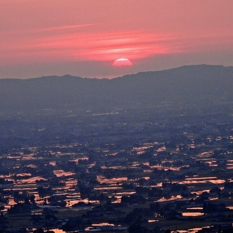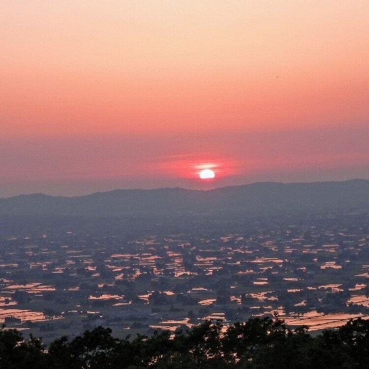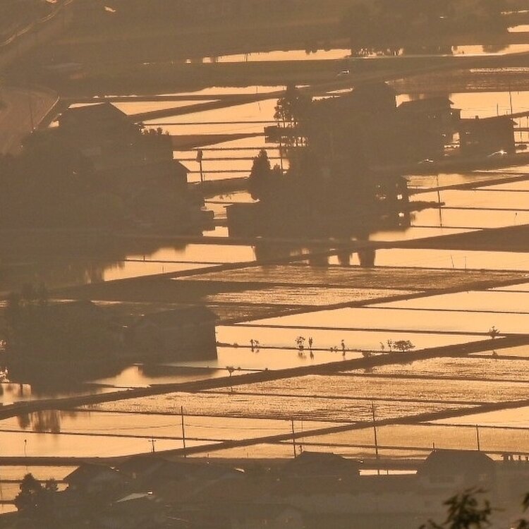 砺波平野 水の張られた田んぼに夕日が差し込み 点在する家家は黄金色に包まれます 黄金色の田んぼは秋になると 黄金色の稲がこうべを垂れて 美味しい砺波野のお米が出来るんですね🍚 季節の恵みに感謝 農家さんに感謝 #アートな景色 #砺波平野 #散居村展望台 #絶景スポット