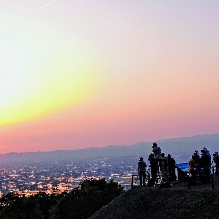 砺波平野の中に 屋敷林に囲まれた家が散らばって建てられている 散居村 田植え時期、水の張られた田んぼに夕日が差し込み 黄金色に染まります 富山県のふるさと眺望点にも選ばれている絶景スポットです #アートな景色 #絶景スポット #散居村展望台 #砺波平野
