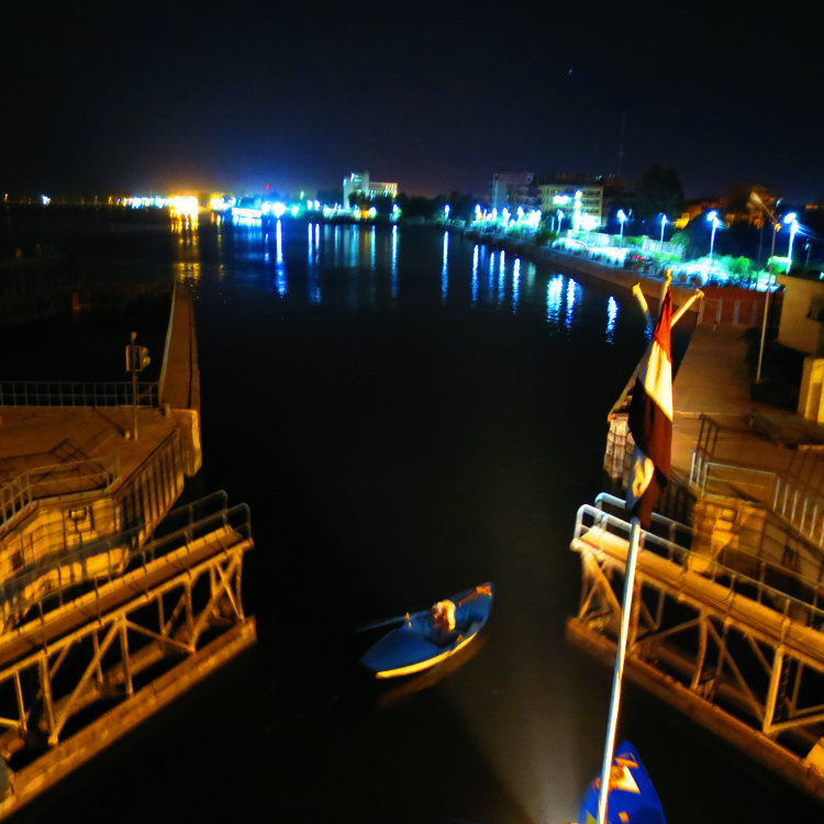 本日最後の投稿はエスナ水門。エドフ方面へ下る途中、水門が開く瞬間。先導士がクルーズ船を誘導します。向こうの街の光が煌めく夜。