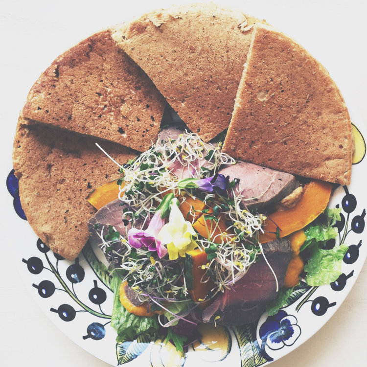 ドライフルーツのパンケーキ 黄色いドレッシングのサラダ
