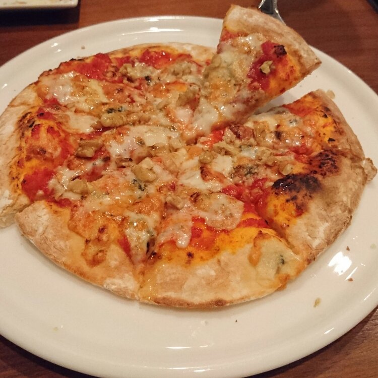 ゴルゴンゾーラチーズと蜂蜜のピザ😋ほんっっっとうにおいしかったです(*´ω`*)チーズ×トマトソース×蜂蜜の味のバランス最高!クルミが入っていてそれも良いアクセントでした🙌