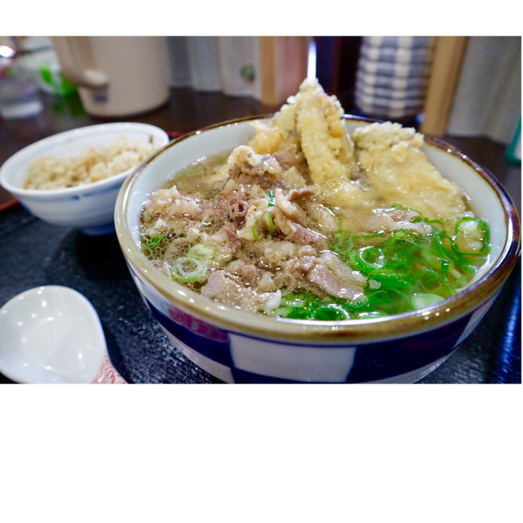 福岡出身の店主のオススメは福岡うどんの定番のごぼう天と牛肉。