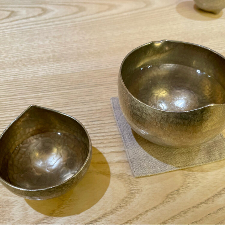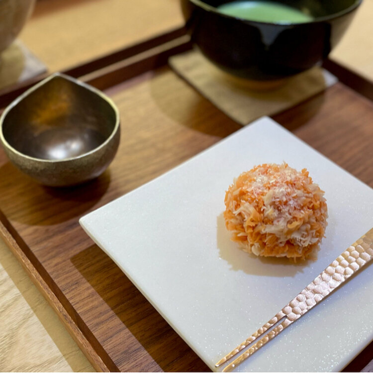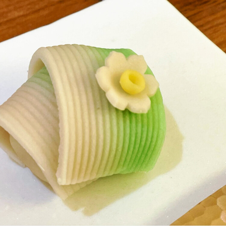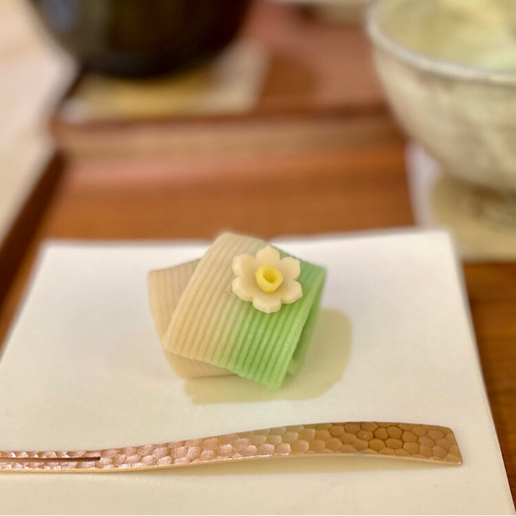 🚌が来るまで、素敵な和菓子やさん 見てみたいねと店内へ 美味しそうな練り切りと こちらで、お抹茶もいただける🍵 ふたりとも阿吽の呼吸で お菓子を選び始めていました😊 私は水仙をあしらった練り切り お友達は、蜜柑の和菓子🍊 中身は蜜柑の羊羹が入っていました 水の器も、水入れも素敵でした😍