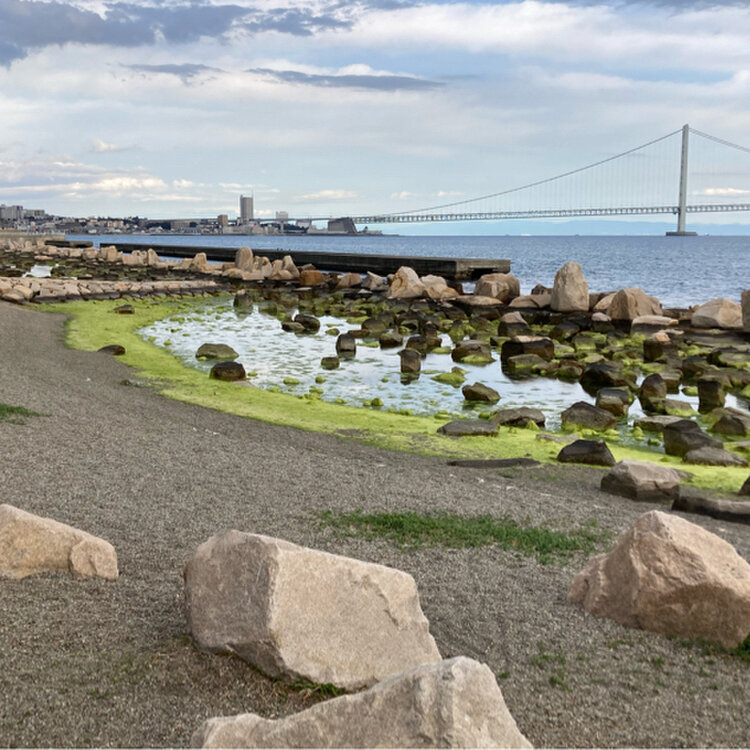 明石海峡大橋や淡路島を眺めることができ、子午線のモニュメントやスポーツのできる広場、BBQスペースや海水浴場など色んな楽しみ方ができる大型の海浜公園です🏖