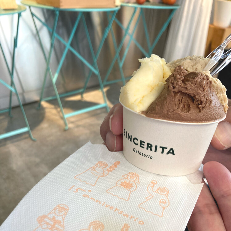 ☆ SINCERITA ☆ 〈 再訪 〉 2月末、暖かかった日にジェラートを ☆ウバティー ☆酒粕カカオ ☆伊予柑 をチョイス。 年間を通して大人気のジェラート屋さん 何を選んでもハズレ無し!! #ジェラート #阿佐ヶ谷 #百名店 #シンチェリータ