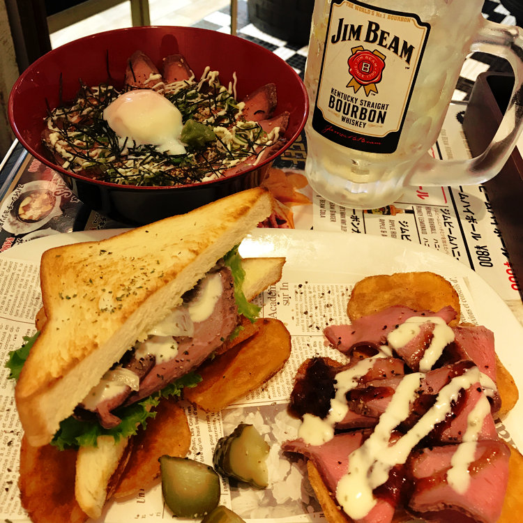 ジムビームバー 新大阪駅マルシェには美味しいお店がいっぱい✨ お疲れ様の一杯&ローストビーフサンド、ローストビーフ丼