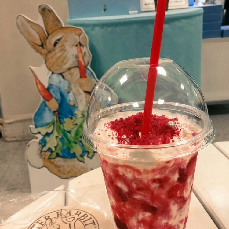 「ピーターラビットの世界展」のカフェでいただける新宿高島屋限定の『3姉妹のベリーミルク』(オリジナルコースター付き)です。濃厚で美味しかった~(^^)