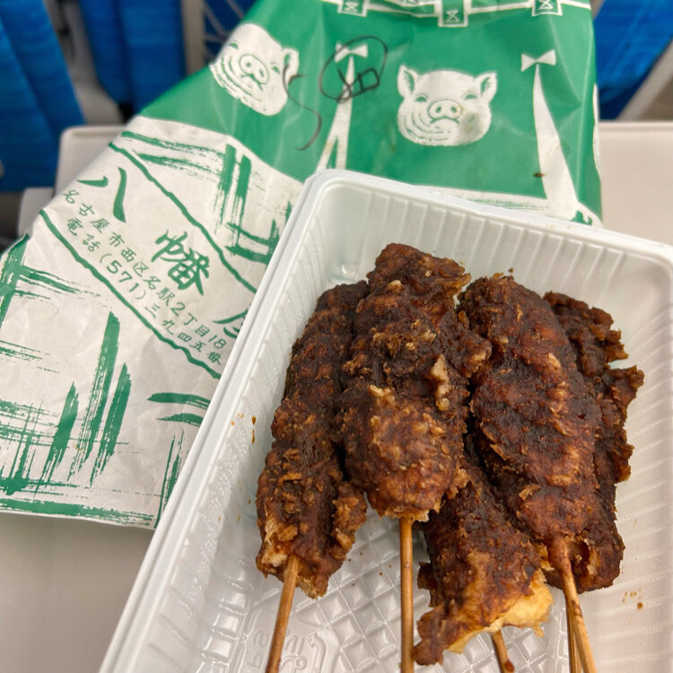 私が名古屋駅らへんでとあることをしている間、旦那に安くて美味しそうだから行ってきな*˙︶˙*)ノ"と、八幡屋さんに送り出したのですが…人気店でしかもこの日は特に混んでいたようで、しばらく待ったけどお持ち帰りに切り替えて新幹線でジャジャーン✨