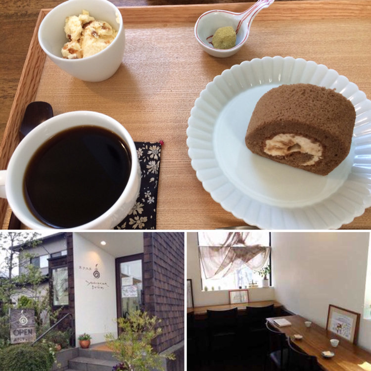 今回は珈琲+いぶろーる(キャラメル)+ハーフスイーツ(ミニチーズケーキ)のくつろぎセットを注文✨煎茶の茶玉も1つおまけのように付いてきます(´艸`*)