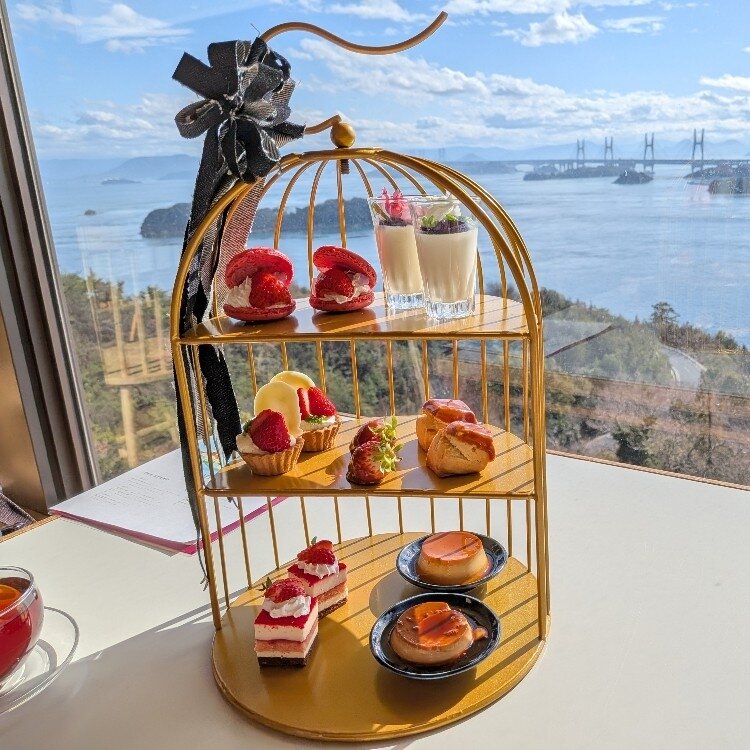 倉敷アフタヌーンティー。 今回は少し遠いですが、鷲羽山まで足を伸ばしました。 瀬戸大橋を望む絶景や、和洋様々なセイヴォリー、苺をたっぷり使ったスイーツスタンドに大満足でした。 展望台付近の散策も楽しく、瀬戸大橋を真正面から眺めることができる東屋展望台はぜひまた行きたいです。