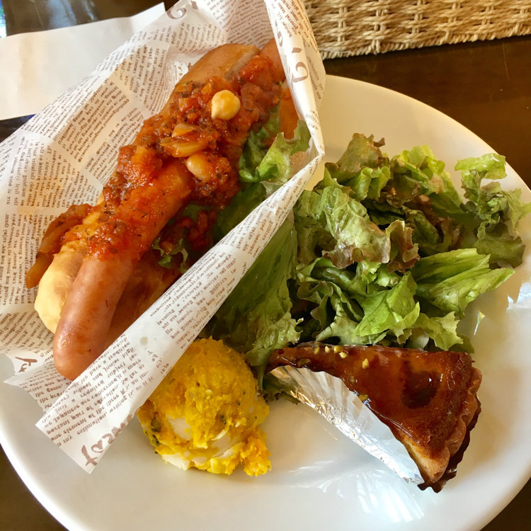 チリビーンズがのったホットドッグのセットです。パンは低温長時間発酵されているので、