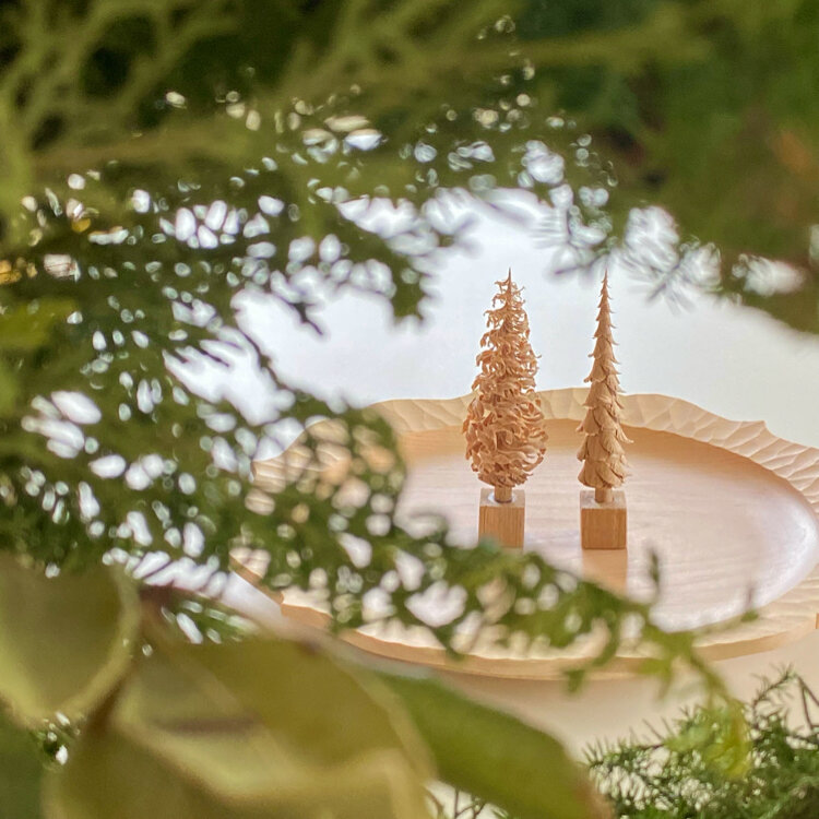 1本1本手で彫ってつくられている高さ10cmほどの小さなツリー「cogu no mori(コグノモリ)」。