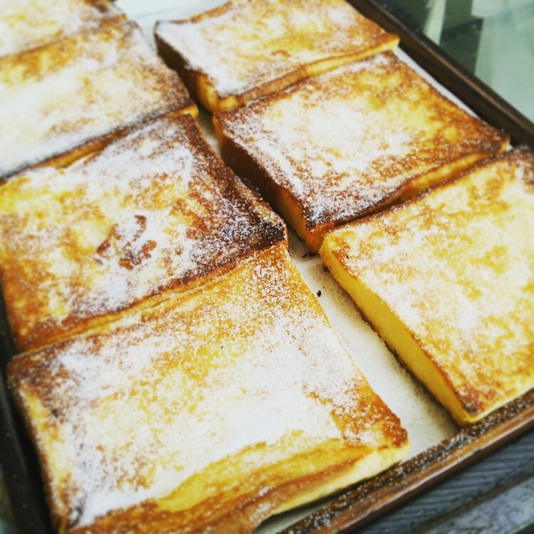 京都の松原通にある「まるき製パン所」のフレンチトースト。昔ながらのおいしそうなパンがずらっと並び、ケースに目当てのパンがなければ、レジでオーダーもできたりするので、ついつい買い過ぎちゃいます。