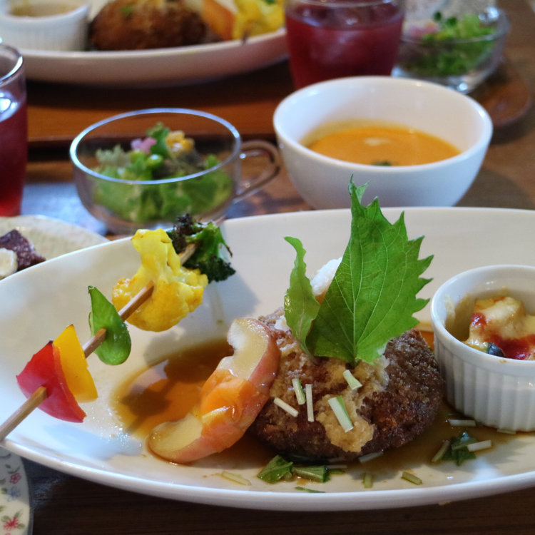 *フラワーランチ* お肉を使わない、野菜とおからこんにゃくのヘルシーハンバーグ♡おろし大根と自家製ポン酢で。 スープは、人参のポタージュスープ(豆乳仕立て)。 サラダは、おからの大人サラダ。 プチデザートは、カステラティラミス。 飲み物は、ハーブティーか、フルーツと野菜のミックスジュースのどちらかを選べます♡ ヘルシーだけど、お腹いっぱい❣️