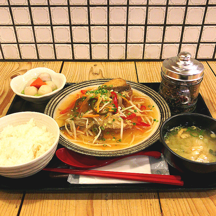 カリカリに揚げられたホクホクの胡椒鯛にお野菜たっぷりのあんかけ。小鉢の芋煮は優しい味付けでホッとできます(*´ω`*)