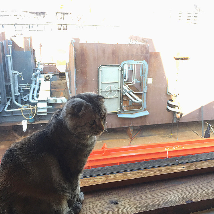 本日も作業中の造船所を眺めながら、可愛い猫ちゃんと触れ合える猫カフェ『美猫』さんにお邪魔しましたー♡ スコちゃん達の個性的な座り方や新人猫ちゃんの初々しさに癒されました( ´艸`) #カフェ#ねこ#猫カフェ#造船所#わたしの街