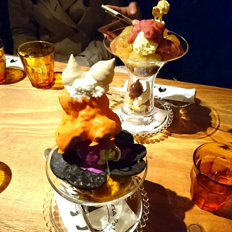 かぼちゃのパフェに一目惚れして即決。手前のオレンジ色が鮮やかなチョコレートのかかったパフェです。友達は葡萄のパフェ(写真奥)を頼んでました。写真にはありませんが、ピスタチオとチョコレートのパフェを頼んだ子もいました。こちらも美味しそうでした…(´∀`)