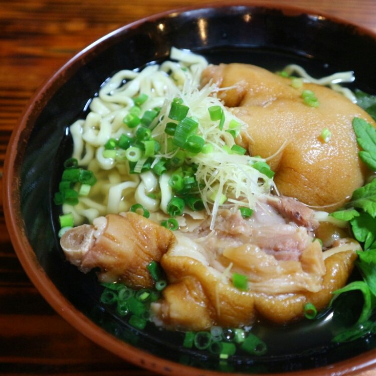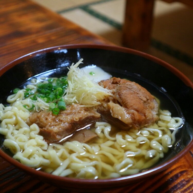 『番所亭』のそばは自家製麺で、うどんの様にもっちりとしていて、鰹出汁のあっさりスープに、上のお肉はプルプルてびちにホロホロのソーキ、柔らか三枚肉などが選べます。