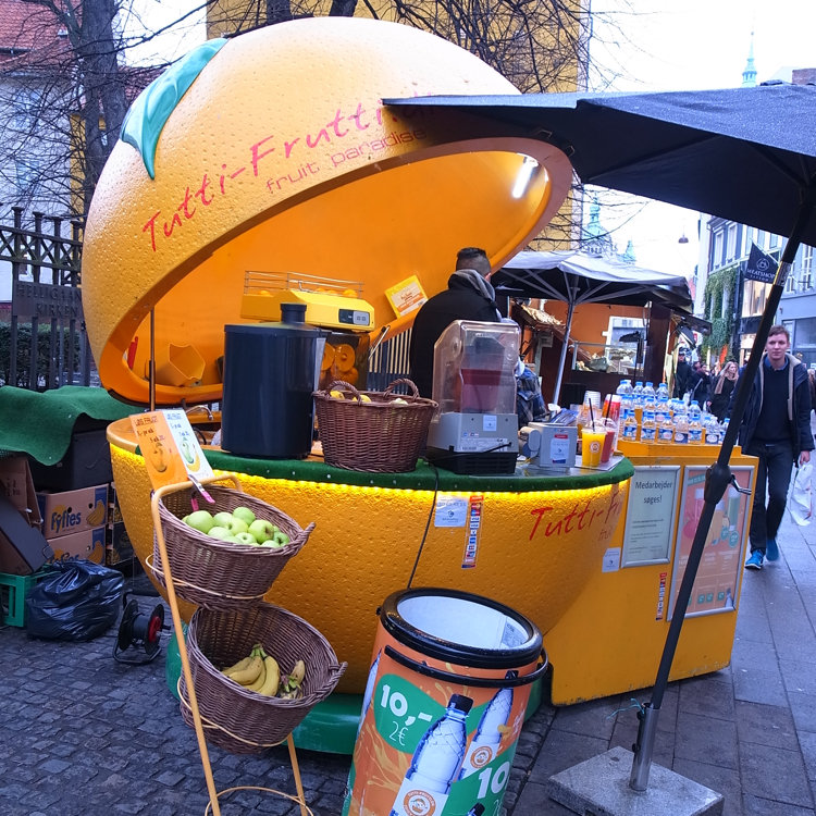 デンマークのコペンハーゲンにある、おしゃれなお店が立ち並ぶストロイエ通り。ここで、サザエさんが踊って出てきそうなジューススタンドを見つけました。フレッシュジュースを片手にショッピングを楽しみました♪
