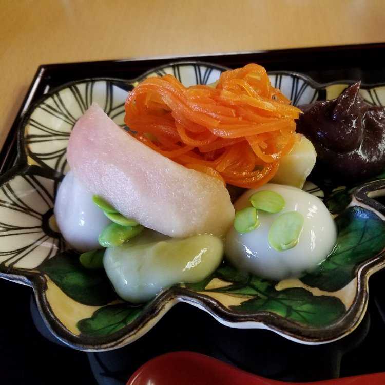熱海MOA美術館内の『花の茶屋』 特製あんみつが珍しくて美味しい😋🍴💕 人参の甘煮、豆は黒豆と枝豆。求肥ではなくもちもちっとした白玉団子。季節のさつまいもの甘煮も乗っていて秋を感じます。 ちょっと変わっていて美味しいあんみつです。💓👍