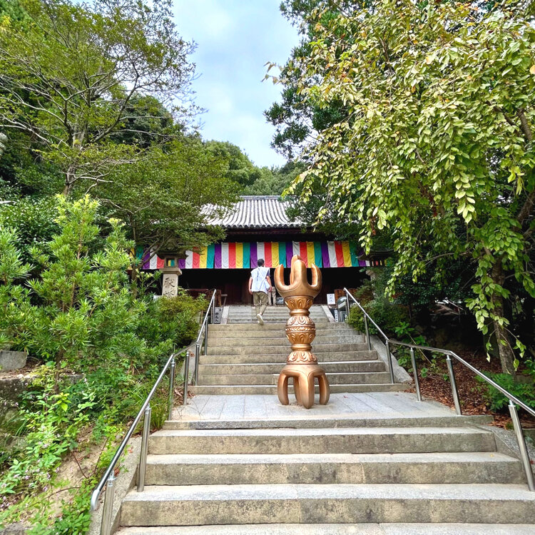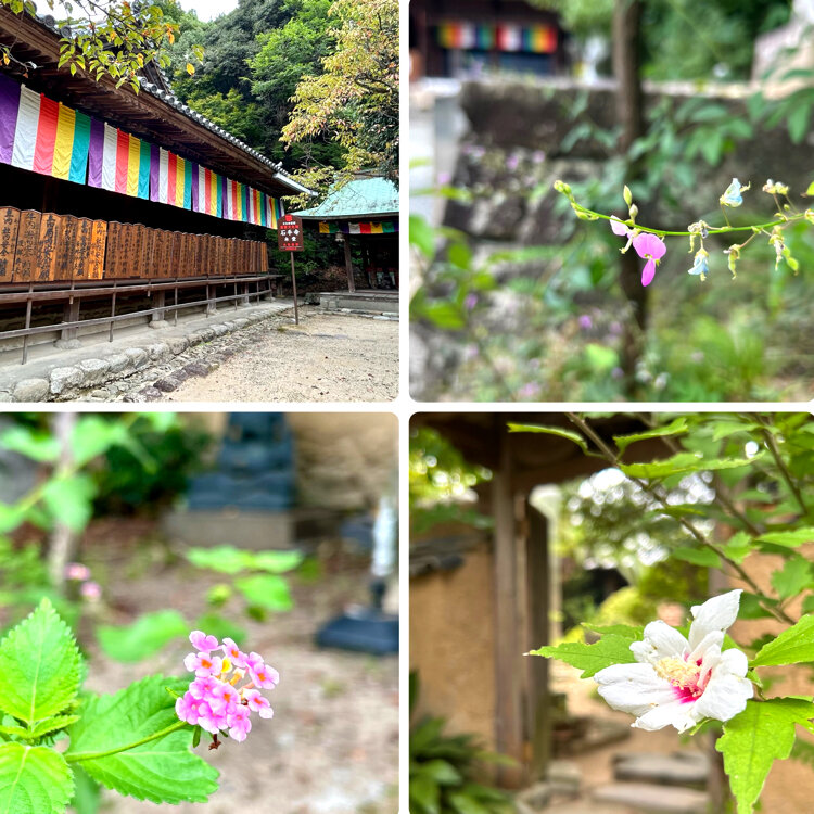 約6.6万㎡もの広大な境内。文保2(1318)年建立された二層入母屋造りの本瓦葺き、鎌倉時代の傑作として名高い素晴らしい仁王門には大きなわらじが置かれ、沢山の一円玉が挟まれていました。国の重要文化財である三重塔は修復中、四国随一の文化財を誇る境内には見所がたくさんあり、花もあちこちに咲き、まだ、3ヶ寺でありながら少しゆっくりさせてもらいました☺️