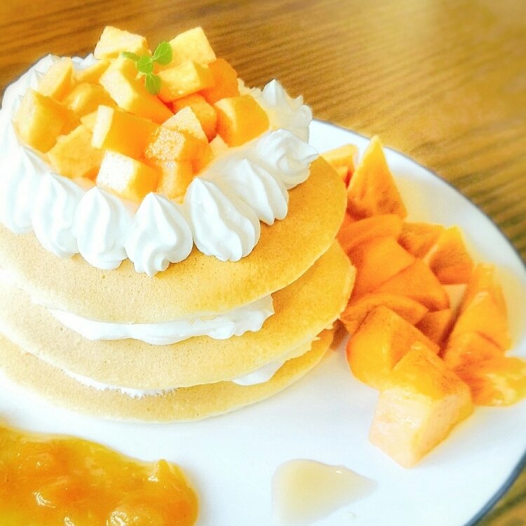 この季節は柿のパンケーキ。ふわふわのもありましたが、こちらのパンケーキがかなり絶品でした。柿も契約農家さんのこだわりの柿でとても甘く美味しい😆パンケーキの間にもそれぞれたくさん柿が挟まれています
