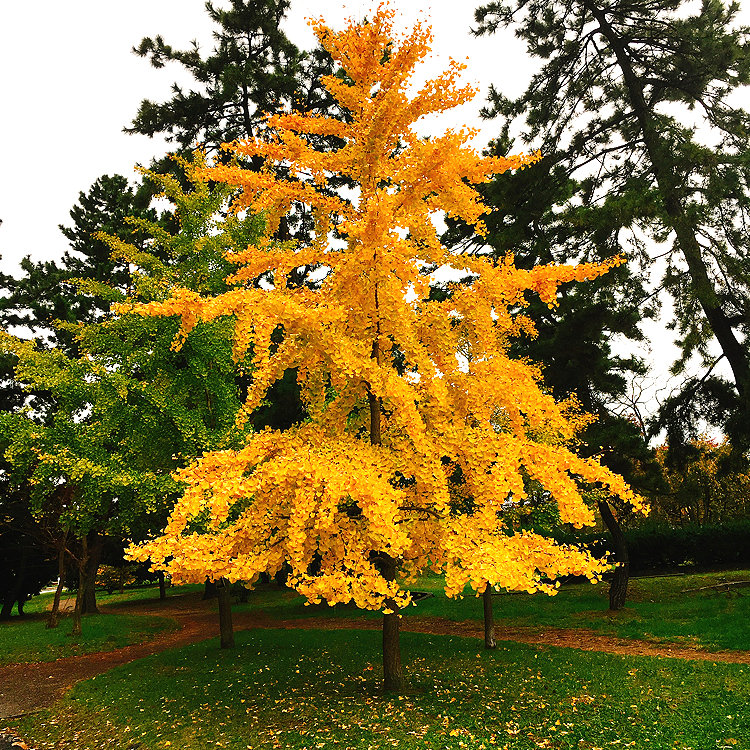 KONさん 公園の中に銀杏の木は他にもあるのですが なぜか この木だけ ものすごく鮮やかな黄色で 一際目を引きます。