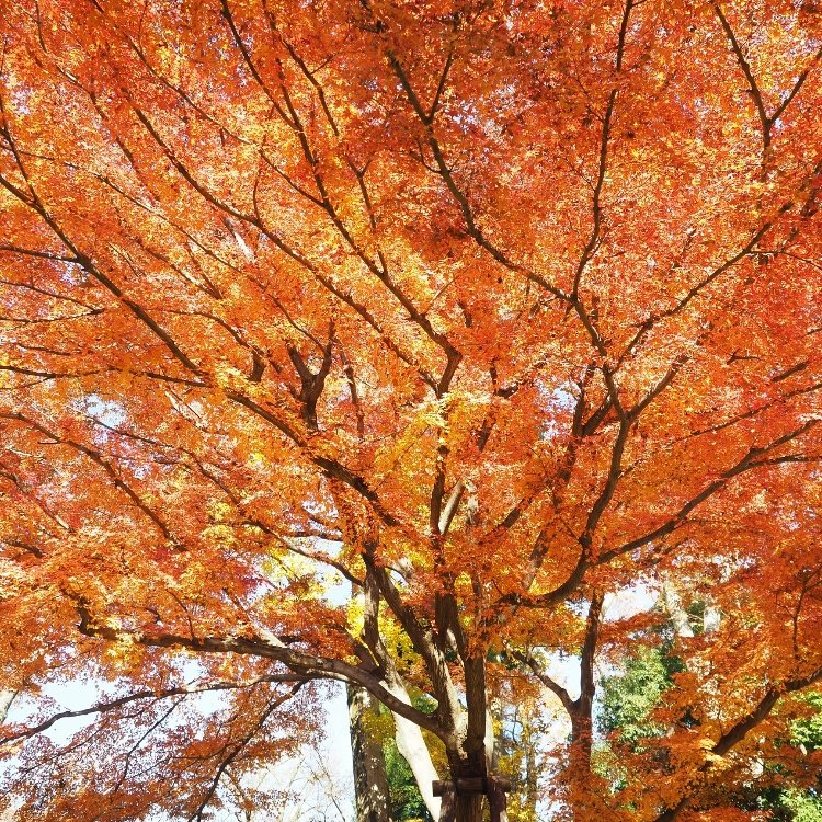 大田黒公園 大きなオレンジの傘の下に入りました。 まるで燃え上がるような炎のようにも見えました。 一色のグラデーションもまた素敵です。 #やはり #紅葉を見るのは #午前中から #出掛けるのが #よいですね #わたしの街