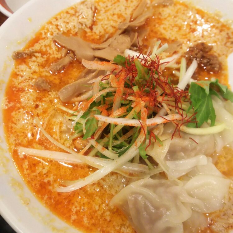 めちゃくちゃ濃厚な担々麺。ピーナッツがすごい。細麺で、とぅるとぅるワンタンみっつ。広州市場のワンタンおいしい。 #ラーメン #大塚 #程よい辛さ #細麺 #2階建て