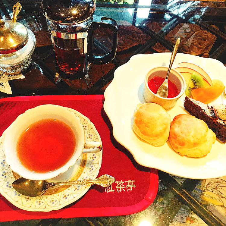 久しぶりに紅茶専門店【紅茶亭】へ 紅茶亭セット 紅茶の種類が沢山あるなか、世界3大紅茶のひとつウバを選び、オーナーさん手作りスコーンとケーキのセットを選びました✨ ウバは高貴な香りでクセのない味。 スコーンはちょっと温めてイチゴジャムを添えていただきました。あっさり、そのままでもイケます🎵
