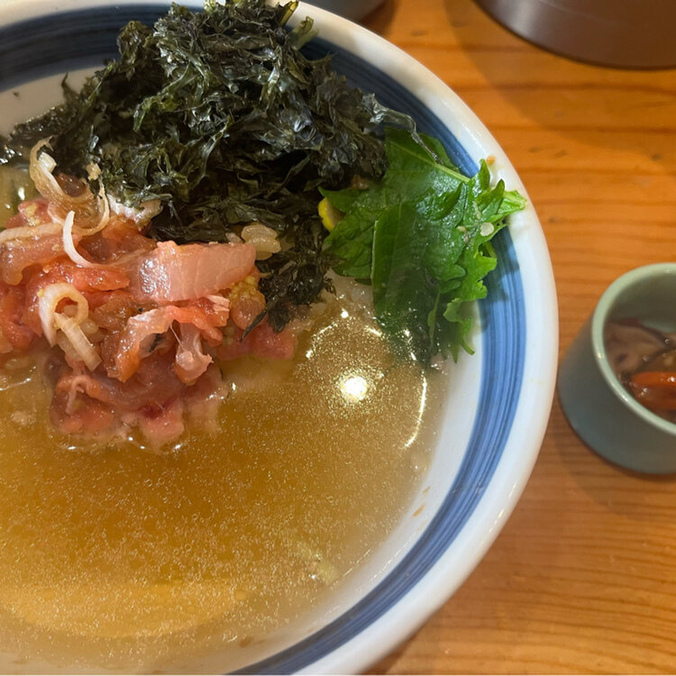 アジのなめろうが小皿で最初に出てきて、一口だけ食べてください、とのこと。海鮮丼をある程度食べ終わった頃、追い飯と金目の出汁が出てきて…なめろうを加えてお茶漬けに♪
