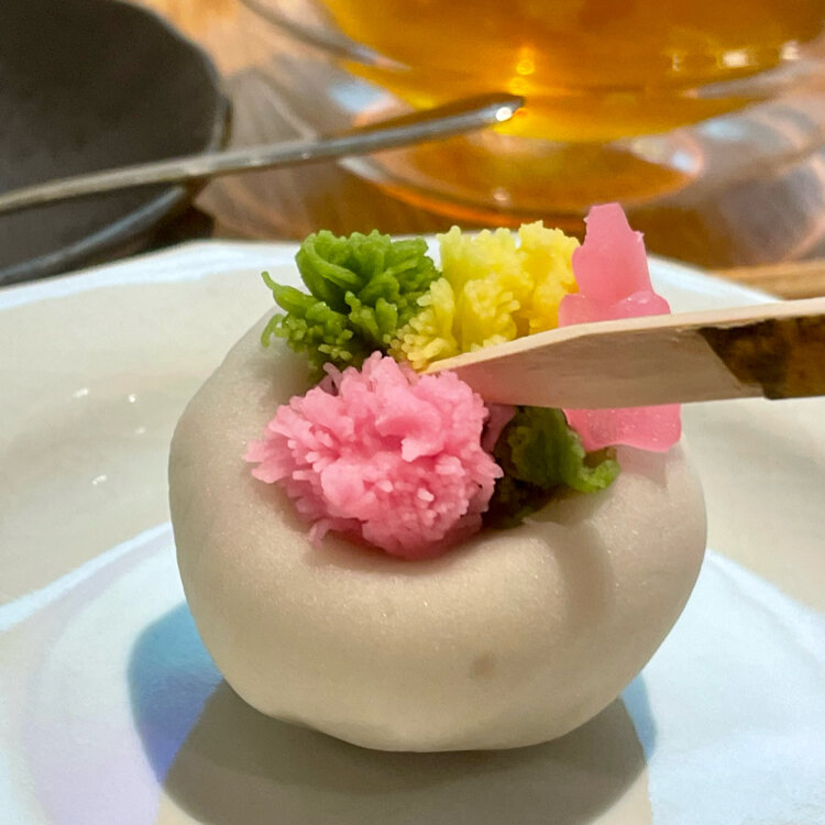お店の看板商品「妖怪大福(いちご、あんず)」と「お花畑(上生菓子)」をスタッフさんに優しく教えてもらいながら作ります…フルーツ大福って難しいですね…まぁ、ぶさかわ♡ってことで、いいか(笑)