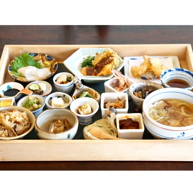 この日は人気の平日限定ランチ「和の箱」1450円を注文しました。数え切れない小鉢に揚げ物、選べるご飯とかけうどんのセットです。これに、スイーツデザートと珈琲が付きます。小鉢も嬉しいですが、うどんの美味しさにも感激です。