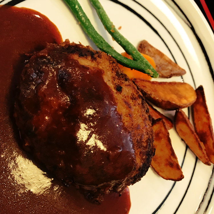 久しぶりにめっちゃ美味しいハンバーグに出会いました! チーズinハンバーグ定食1100円! ごはんとお味噌汁とミニサラダとデザート(この時はコーヒーゼリー)がついてきます。ランチメニューには載ってなくて、店内の黒板に書いてありました。ハンバーグはうっすら衣が付いてて外側こんがり中ジューシー。箸を入れた時の溢れ出る肉汁もすごかったですが、お肉がやわらか〜い♪ ごはんは少し固めが好きなので美味しくて、お味噌汁はだしが効いててこれも美味しい。サラダも新鮮。あと付け合わせのインゲンが揚げ焼きでパラっとかかった塩加減も絶妙でした。コーヒーゼリーは甘くなくて食後の口の中がサッパリ! ランチはプラス200円で飲み物が付けられたのでアイスティーもいただきました。あー美味しかった! 次は何にしよう♪