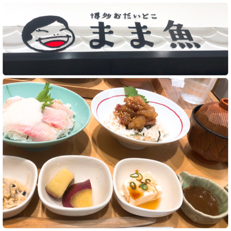 ソラリアプラザにあるお魚中心の家庭料理のお店『博多おだいどこ まま魚』 魚釣りができるので有名な居酒屋さん「ざうお」系列のお店ということで、新鮮なお魚の丼を中心に定食を食べることが出来ます(´∀`) 本日、頂いたのは『華海鮮丼と鯛茶漬け』 こちらの魅力はミニサイズの丼を二種類選んで定食にできること! あれこれ食べたい私にピッタリ♪ 最初はそのまま丼で、後から温かいのお出汁を持ってきて貰えるのでホカホカのお茶漬けも楽しめます(^-^) #ランチ#海鮮#定食#わたしの街
