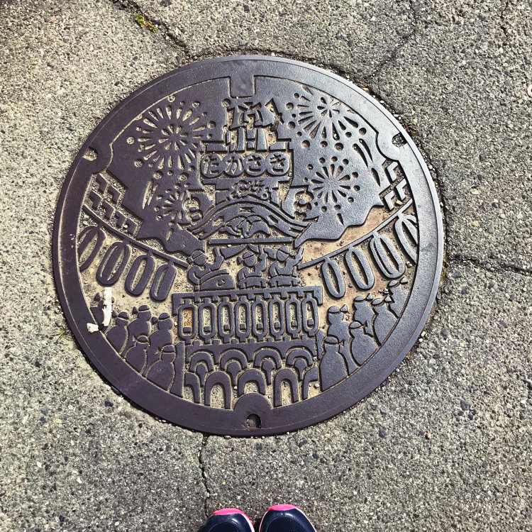 愛知に帰る前に、歩いて高崎駅まで行く途中、ステキなマンホールをみつけました♡ 高崎祭りの山車と花火をデザインしたものでした😍