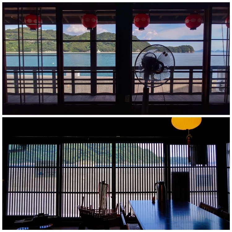 上の写真は2階席です。窓の外に吊られた提灯、窓越しに見える海と島。