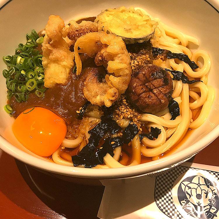 こしのあるゆがきたてのうどんと別所産のご飯に お店独自のだしを加え、胡麻、卵黄、海苔、天かす、ネギ、わさび、揚げたての天ぷら