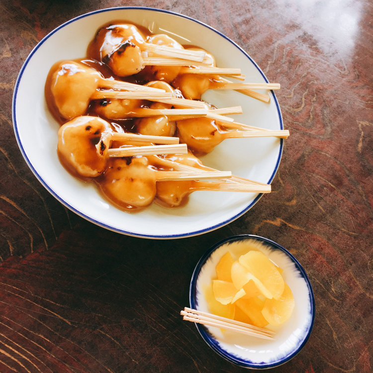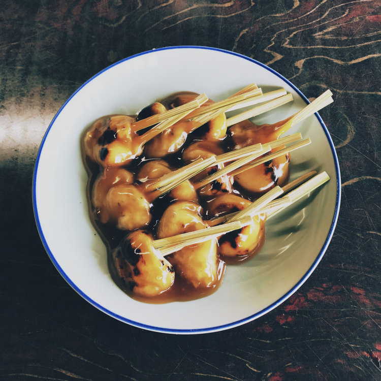 【鹿児島/市内:吉野】鹿児島の郷土スイーツ。両棒餅と書いてぢゃんぼ餅と読むそうです。味はみたらし団子に近い感じです。タレは甘すぎず、餅は焼きたてで柔らかく香ばしい。県内どこにでもあるという訳ではないようなので、ここを通ったら是非。#スイーツ#名物#鹿児島
