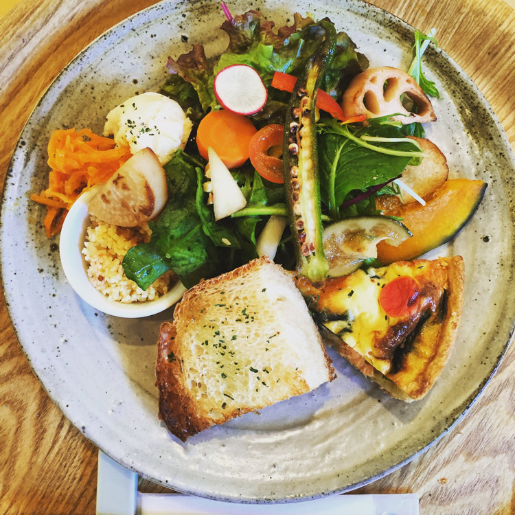 佐賀駅近くのmalleというカフェ。 野菜たっぷりのキッシュプレートです。 他にも豆腐ハンバーグランチを食べましたが、野菜がたっぷりで、優しい味ですよ。 店内でベーグルを買えます。