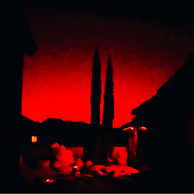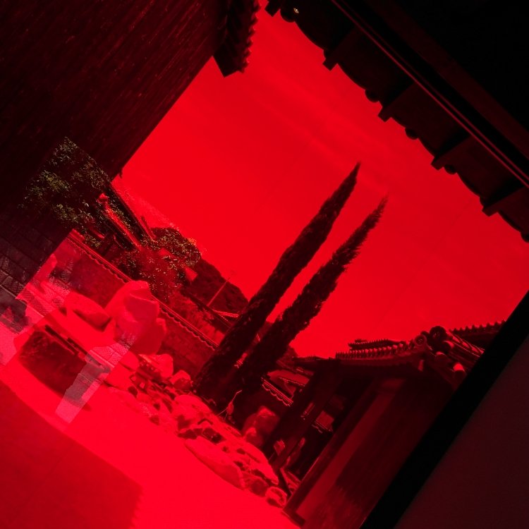 入口の赤ガラスから見える内部はさらにおどろおどろしくて、赤い世界に浮かび上がる二本の糸杉が怪物の爪痕のようです。