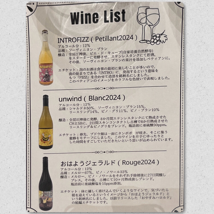 品種 :メルロー67%(樹齢7年、収穫日2024.11.2)、ピノ・ノワール33%(樹齢7年、収穫日2024.10.12、10.28)