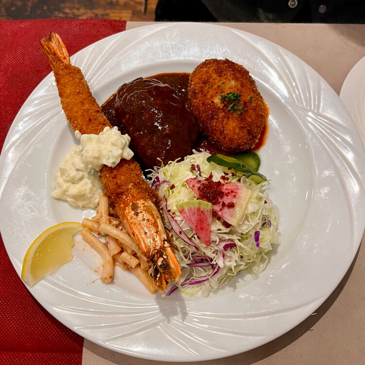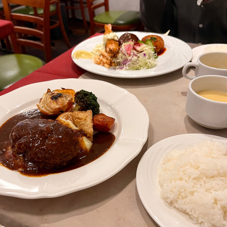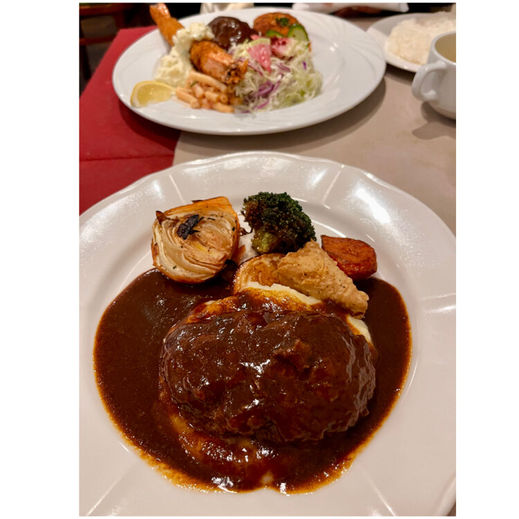 『洋食屋アシェット』 大寒波の8日❄️🥶 以前からの予定で神戸へ 夕方娘と落ち合って夕食を🍴 神戸牛のステーキが食べられる 元町の老舗「伊藤グリル」の姉妹店で カジュアルな洋食屋さんです。 娘は1番人気のアシェットセット 淡路牛のハンバーグと 特大エビフライ🦐 クリームコロッケのついた いいとこすべてがつまった一品✨ 私はすでにいろいろ食べていたので 淡路牛100%の煮込みハンバーグ✨ 食べてる途中から満腹に🤣 この後ルミナリエに行くので 早めの夕食でした。 でも濃いデミグラスソースで煮込んだ ハンバーグはふっくら柔らかで マッシュポテトのクッションにのって すごく美味しかったです😍 ・ ・ #開運旅 #ことりっぷと一緒 #洋食屋アシェット #伊藤グリル #レストラン #洋食 #ハンバーグ #淡路ビーフ #エビフライ #神戸洋食 #神戸ディナー #神戸ごはん #旅のごはん #元町 #神戸 #神戸市 #兵庫県 #兵庫 #ことりっぷ神戸
