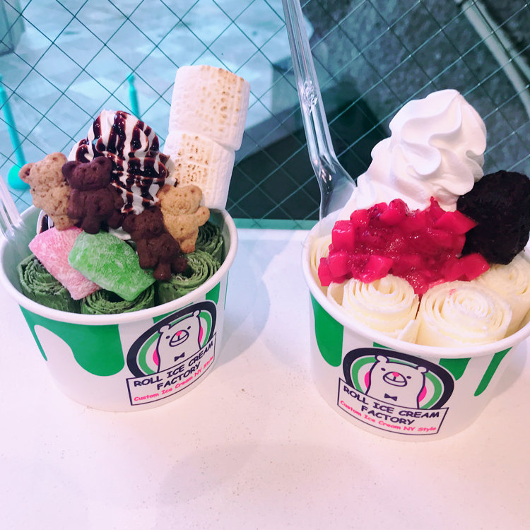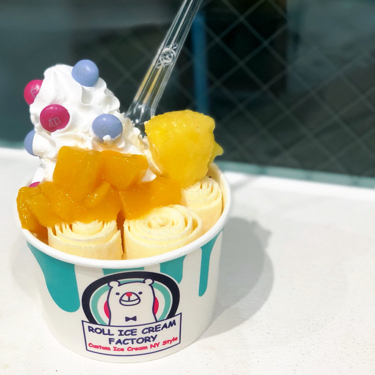 最近日本に上陸したロールアイス🍨✨ 鉄板に液状のアイスを流し込み くるくる巻いてトッピング! アイスのフレーバーはもちろん トッピングも組み合わせ次第で無限大です! 私はバニラアイスにマンゴーを混ぜて トロピカルなアイスを堪能😋💚 雨の日ならそんなに並ばず食べられるかも…?🤔☔️