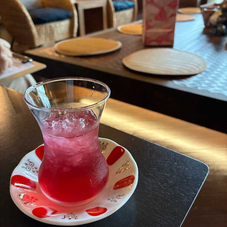 琵琶湖ビューのロビーでウエルカムドリンクの赤紫蘇ジュースをいただき、お部屋に案内してもらいました