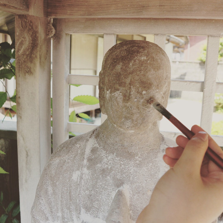お地蔵様に綺麗になってほしいところに白粉をつけさせていただきます